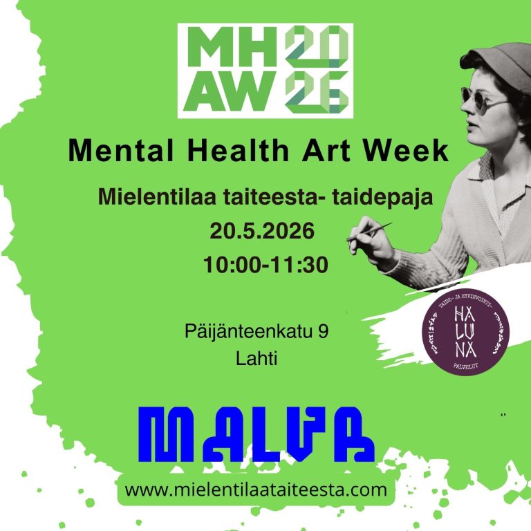 Työpaja on osa Mental Health Art Week 2026 -ohjelmaa, toteutettuna yhteistyössä Mieli ry:n ja Lahden visuaalisten taiteiden museo Malvan kanssa.
